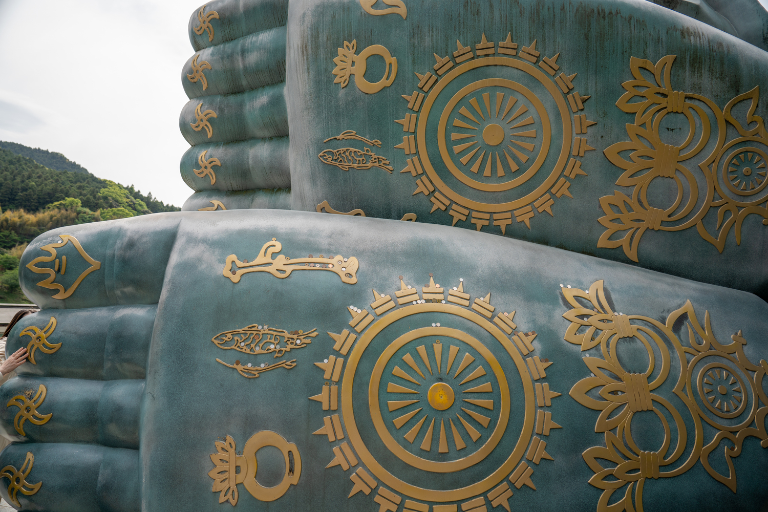 Beneath the Buddha’s feet are intricate patterns—sacred symbols known as “Bussokumon.”